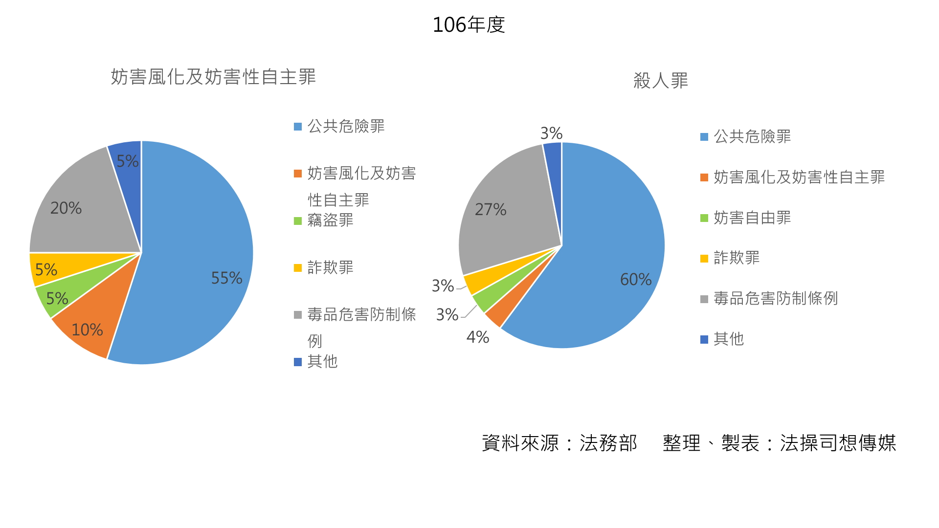 以「妨害性自主」及「殺人罪」為例,「妨害性自主」的假釋再犯率為3%,五年內平均再犯人數為14人;「殺人罪」的假釋再犯率為8%五年平均再犯人數為33人。兩罪再犯都以公共危險罪為大宗,兩罪再犯同罪的狀況,相較於上述各罪低。