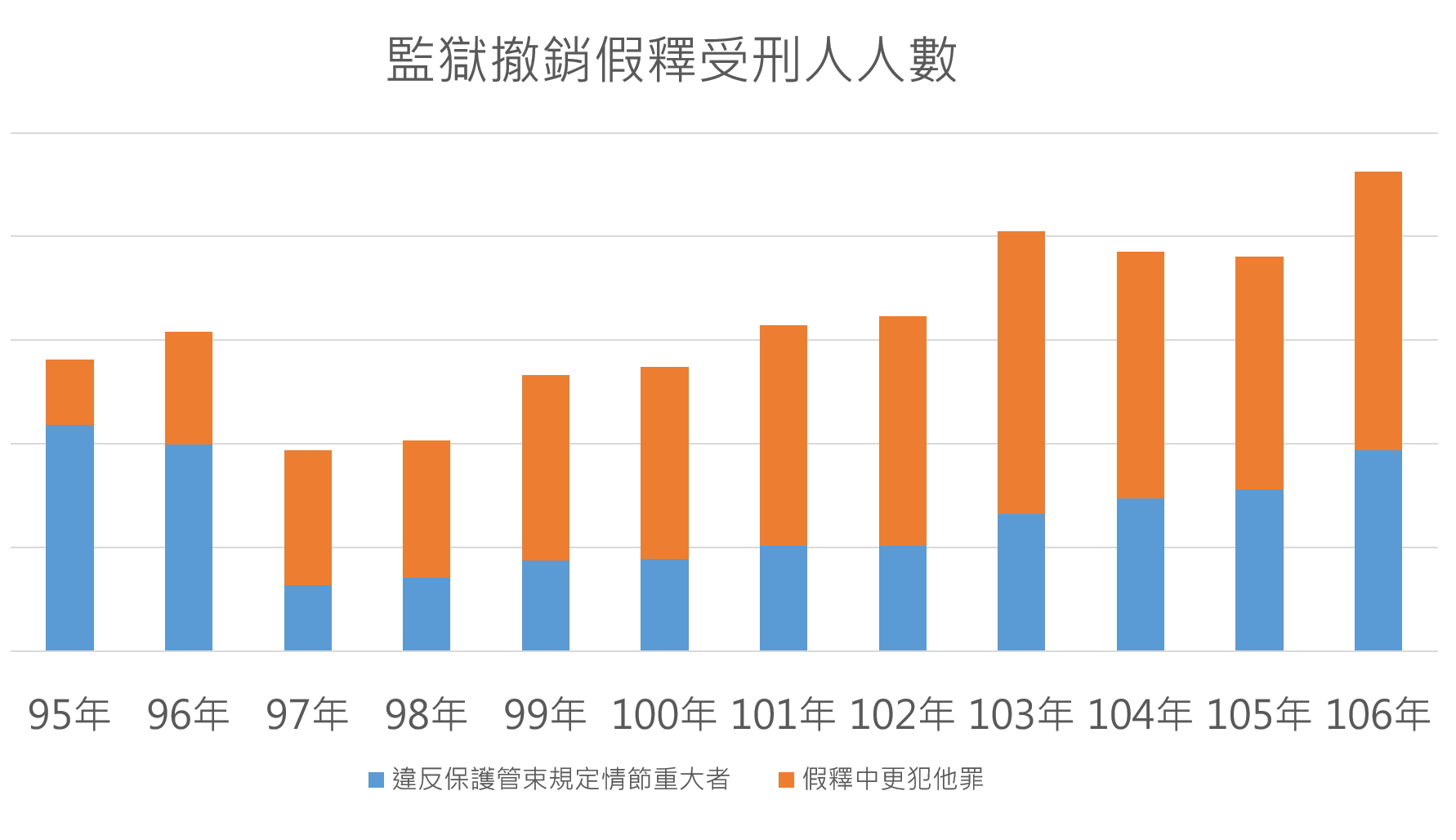 每年約有1萬人獲得假釋出獄的機會,但每年也有約1500人假釋遭到撤銷。從圖表中可以看到,從民國97年開始,撤銷假釋的原因,多是因為在假釋期間中更犯他罪。且這當中,以再犯毒品案件的為大宗。但這樣的圖表就代表假釋後再犯率很高嗎?其實不然。