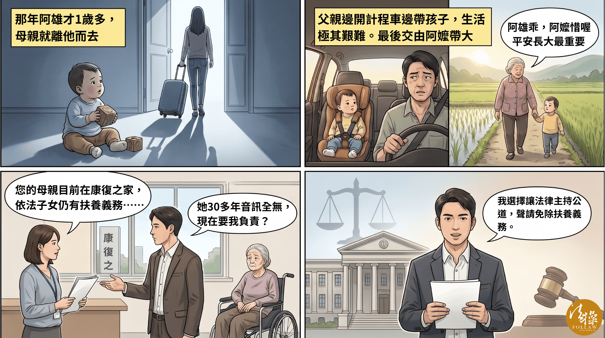 近期有則新聞報導指出,男子阿雄自幼成長環境艱困,1歲多時母親即未再照顧,由父親一邊開計程車一邊撫養,但因車上帶著孩子影響生意,生活更加不易,後來改由阿嬤帶回南投照顧數年。阿雄3歲時父母離婚,此後母親便音訊全無,長達30多年未曾履行任何扶養責任。