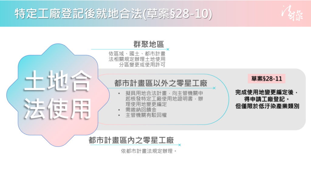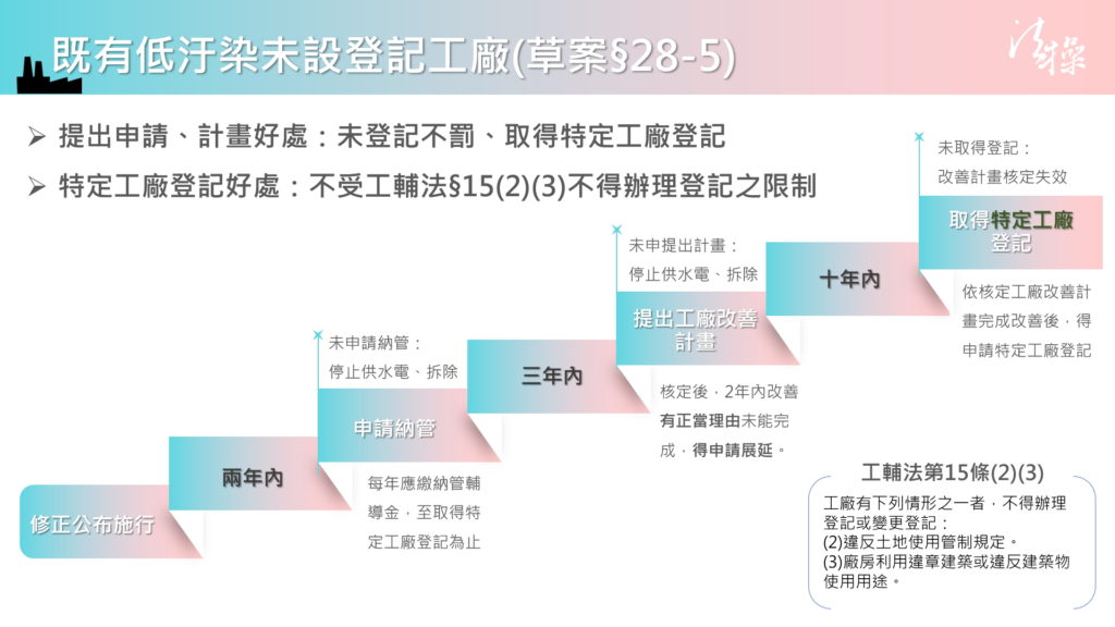 關於這點,政院版草案§28-5僅規定需在10年內取得特定工廠登記。雖然草案§28-7規定,取得特定工廠登記之工廠在取得土地及建築物「合法使用文件」前,每年需繳納管理金。但法條並未針對特定工廠申請轉型為合法工廠的期限。