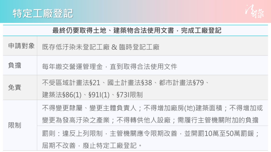 三、取得「特定工廠登記」後,最終仍要取得土地、建築物合法使用文書,完成工廠登記
