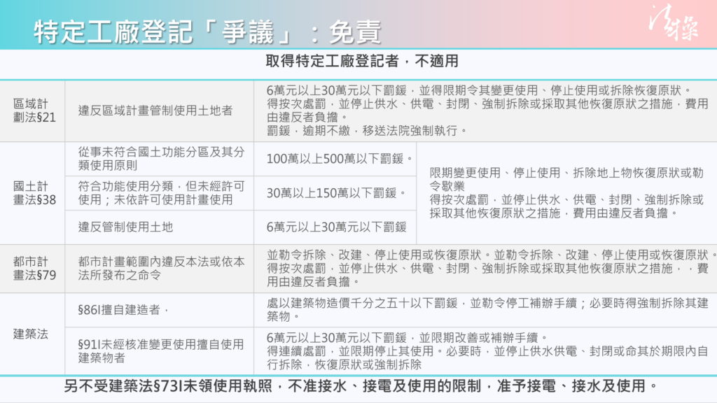 二、特定工廠可以不受區域計畫法、國土計畫法、都市計畫法、建築法、農業發展條例等規範