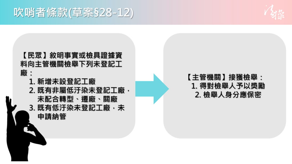 本草案進入經濟委員會進行審查後,追加了「資訊公開」原則,規範應公布轄內新增及計有未登記工廠之名單;及五年一次的滾動式檢查等2決議。但此次委員會中未通過的附帶決議,更令人關注。